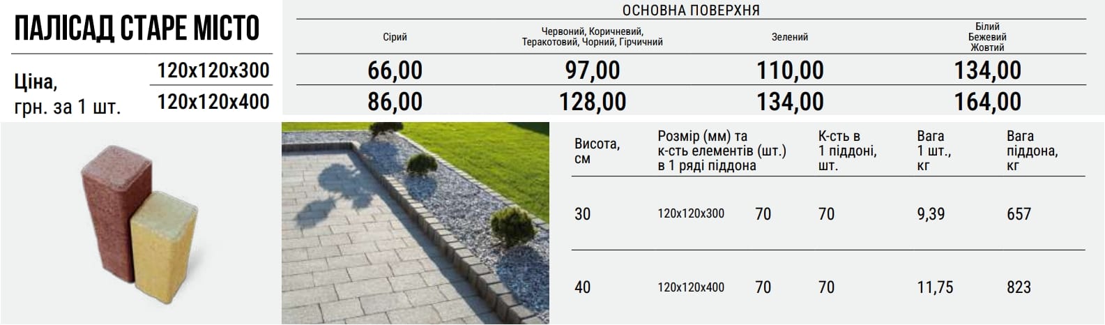 Палісад «Старе місто» в перерізі має класичну прямокутну форму зі скругленими кутами та особливо гармонійно виступає в тандемі з однойменною бруківкою “Старе місто”. Палісад «Старе місто» служить для декоративного огородження замощених площ, клумб, газонів.