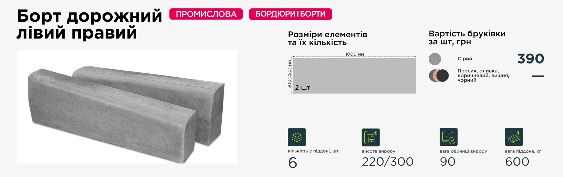 Борт дорожній Лівий Правий – мінімізує ризик руйнування проїжджої частини, утримує тротуарну плитку від зсуву і тим самим зберігає цілісність дорожнього покриття.