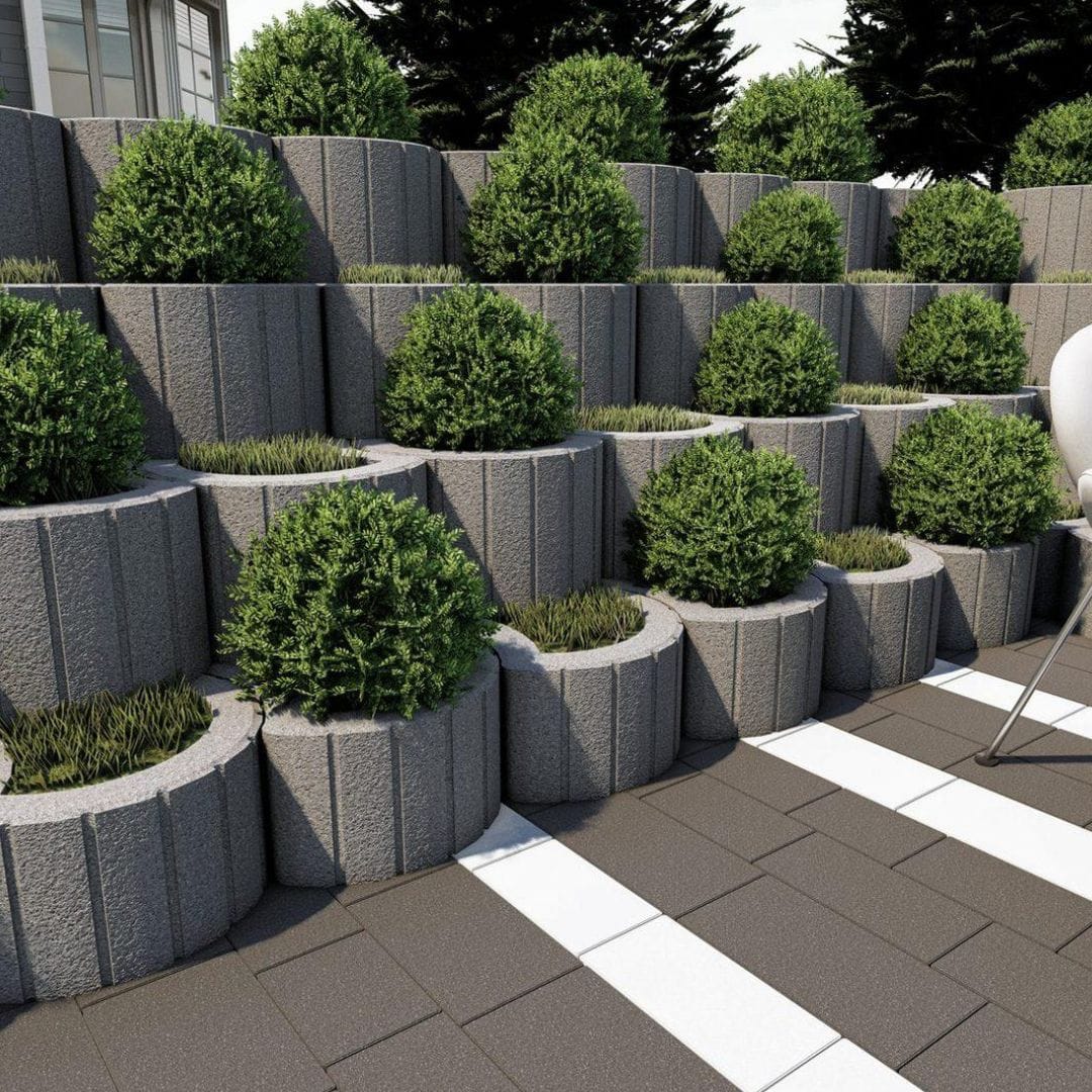 Бетонну клумбу можна встановити стінкою на рельєфних поверхнях, адже особлива форма квітника забезпечить стійкість конструкції.