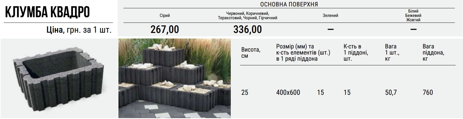 Клумба «Квадро» вирізняється своєю чотирикутною формою. Такий дизайн сприяє більш раціональному використанню простору при створенні різноманітних конструкцій із клумб.