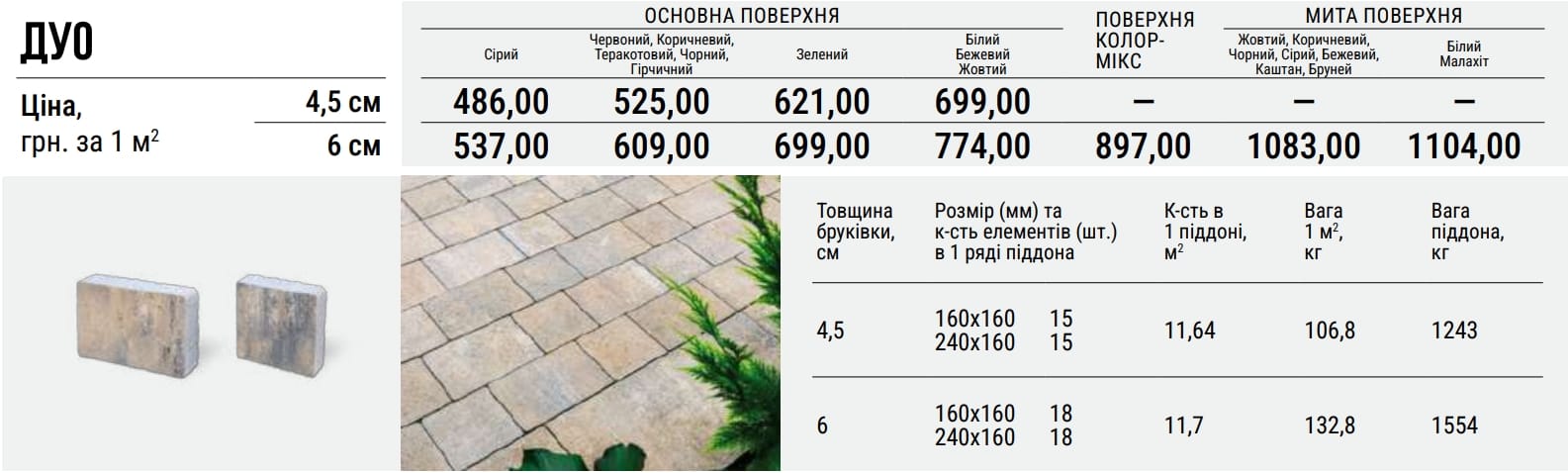 То ж якщо ваш девіз — мінімалізм та простота, сміливо обирайте дану бруківку і будьте певні, що потрапите у тренди сучасного дизайну. Тротуарна плитка Дуо найкраще виглядатиме у геометричних схемах укладання з повторюваними елементами. А найбільш стильною буде однотонна поверхня світлих відтінків.