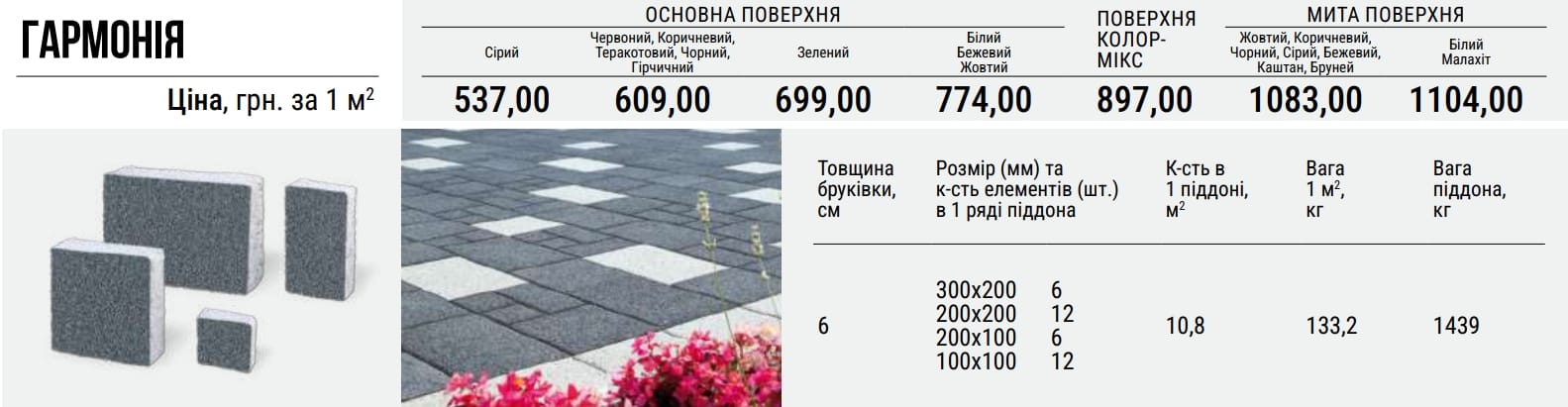Поверхні, замощені Гармонією, приваблюють акуратністю та симетрією геометричних форм і ніколи не виглядають монотонними. Дана бруківка надасть сучасного вигляду міським площам та тротуарам, просторим дворам, під’їзним шляхам, терасам кафе.