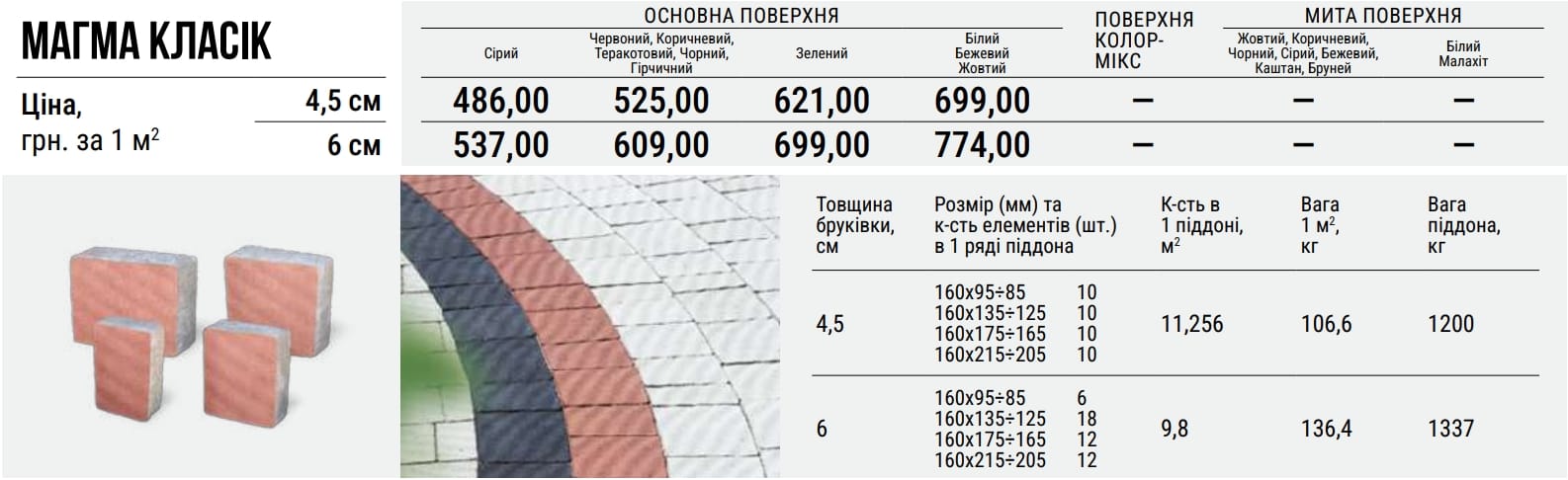 У комплект бруківки “Магма класік” входять чотири елементи середнього розміру з нерівними краями та поверхнею. Їх поєднання дозволяє запобігти монотонності замощеної ділянки, урізноманітнює її.