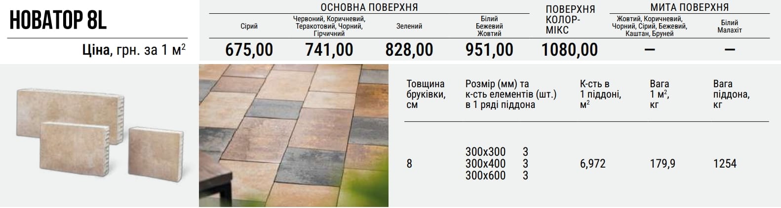Таким чином ми отримали практичний та надійний комплект бруківки. «Новатор 8L» — універсальний вибір для замощення середніх та великих за площею територій, розрахованих на помірне навантаження.