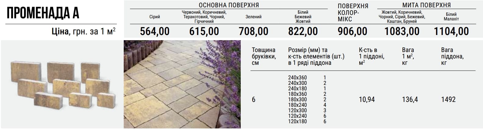 Комплект Променада А налічує дев’ять елементів прямокутної форми. Краї та поверхня бруківки мають незначні нерівності, що надає виробу більш природного вигляду.