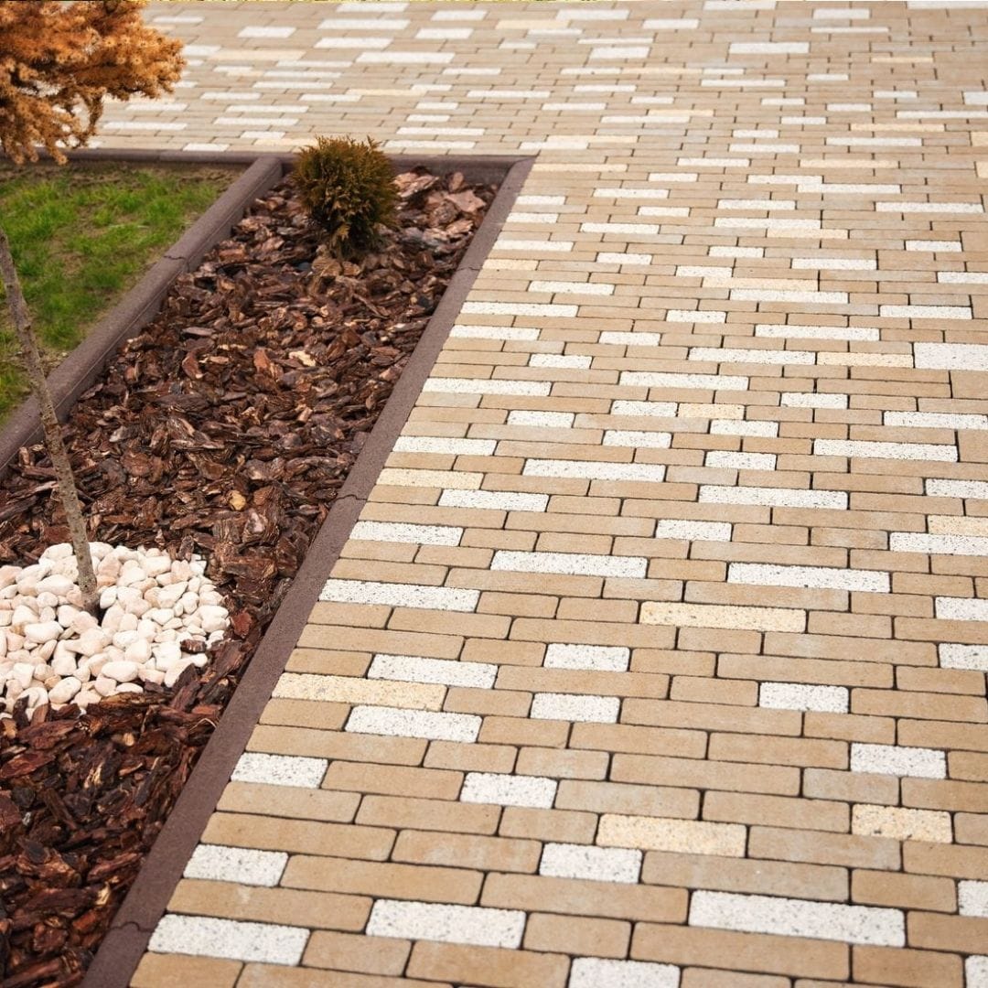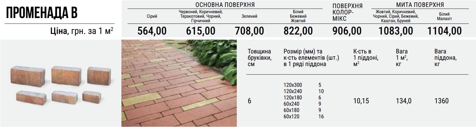 Комплект Променада В налічує шість елементів прямокутної форми. Краї та поверхня бруківки мають незначні нерівності, що надає виробу більш природного та невимушеного вигляду.