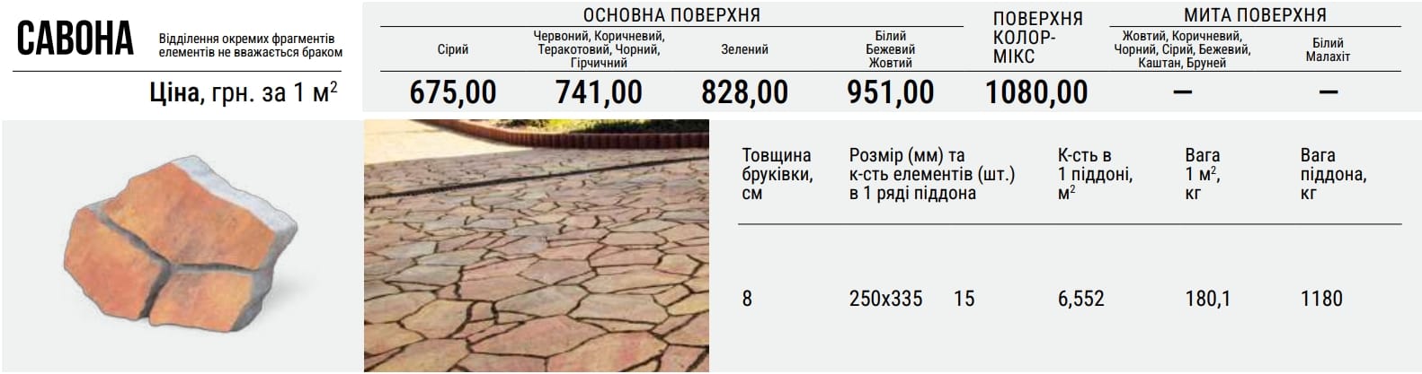 Лінія тротуарної плитки “Савона” містить 15 базових елементів одного розміру, проте з різним розташуванням внутрішніх швів, що імітує колотий камінь та надає фрагментам неповторності.