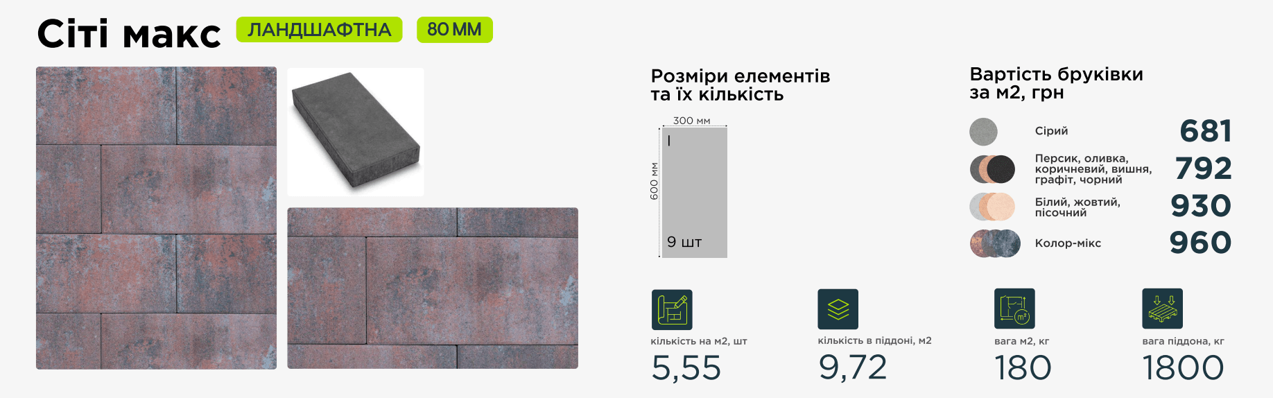 Сіті Макс — це збільшений формат тротуарної плитки Сіті з товщиною 80 мм, що робить замощену територію візуально масштабною.